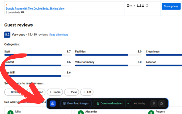 Download high-resolution images and reviews for stays, attractions, and cruises from Booking.com. Get everything in one organized ZIP file for images and export reviews as a csv file.